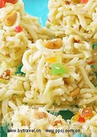 萨其玛,汉语为金丝糕。萨其玛是满族的名糕点,民间传说是一位满族的将军留传下来的。因其好打猎,为携带方便,故制作这样一种糕点。其原料是以鸡蛋和白面做成的细条,过油煎炸,再蜂密、白糖、瓜子仁,成金糕条。糕面撤上青红丝,其味香甜可口。