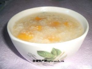 在潮阳县两英镇的大小餐馆里,经营的食谱比别处奇特,除有参鸡鱼翅外,还卖番薯粥。上馆子吃番薯粥者甚多,有的人虽然就餐佳肴,满席之时却也非品尝一碗番薯粥不可。番薯粥是用番薯切丝拌白米稀煮而成,原是潮汕经济作物区农民的家常便饭,不登大雅之堂。在党的十一届三中全会后,随着农民生活的日益提高,番薯已很少见了。几度桃红,人们对白米饭、鱼肉食腻了,番薯粥便又应运再生。“两英番薯粥确实好食。”这是外地游人的啧啧赞语。其中因由在于两英番薯比别处喷香。两英地处大南山北麓,耕地沙质土,疏松透气,不肥不瘦,干湿适中,宜种番薯。出产的番薯,皮薄肉厚,富含淀粉,比较其它地方番薯,肉质松脆香甜,用它切丝伴白米煮粥,味道自然比别地独特。两英番薯粥配以豆酱姜为咸料,更显可口。番薯可煮粥,当然也可煮饭,两英番薯饭味道更香美,若用青炒韭菜,油煎咸带鱼作佐餐,将使你食欲大振,饭量大增。