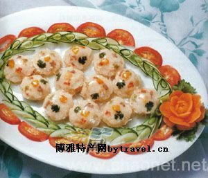 (4)将一串虾胶分别酿在20个小碟上(小碟要先涂上猪油),然后将鱼翅放在虾胶上面, 又一次酿上虾胶,再用蛋白抹滑,放上火腿术, 芫荽叶、芹菜末、金笋化,放入蒸笼用旺火炊熟,取出鱼翅,摆砌盘间,把原汤约100克调上味,用生粉水勾芡淋上即成。 BNBVISTA.COM