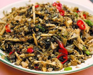 有一味地道的南雄菜,叫“南雄三宝”,其实就是茄子、酸菜和辣椒混炒,这几种都是南雄农村菜的佳品,可以完全体现出南雄菜的咸、香、酸、辣,因此备受欢迎。