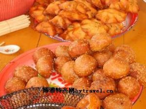 水油堆,壮家特色小吃之一。在一些古老的街道或者学校附近,经常可以看到上了年纪的老人,仅凭着一个锅头,一堆炭火,一瓶油,一盆面粉,一碗芝麻,转瞬之间,白面在油锅里上下翻腾,白进黄出,一股浓浓的香味在街道上空弥漫,久久不散。