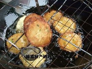 一般年节时下得空,乡下人便可以将自家舂的新米,村头石磨磨成白米浆,取了家来配以时令素瓜菜切成丁,分置几个碗碟里,准备妥当。然后架起一油锅,烧旺火,锅一侧边缘搁上一铁丝盘就网状铁架,架子四角通常带向下四条铁丝小腿,可锅边稳稳扣好。待到油得九份热, 用一勺子舀了米浆填那瓢子里去,此刻手要稳稳,让浆水自瓢中心向外渐渐铺开(米浆浓度要厚,如同没牙的小孩吮的那米浆。)。此刻佐料部分可一起匀入米浆里调好了,也可以留下部分精萃的,比如河里小虾米碎末,或者,碎猪肉之类的,带米浆在瓢里匀匀铺开后将其夹入到米浆的中心部分去,再舀部分米浆搁上头,将佐料埋置妥当。最后米浆会匀匀的缘着瓢的形状呈了粗浅的一个五角星外形,此刻手持长柄将瓢子稳稳沉入锅底最热的地方,米浆紧附于瓢内,不让溢出。火可大可小,将油温控制在一定范围内,待到查其外形渐渐变色,且经油炸成形,可轻晃瓢子将之剥落。要火候把握得当,则脱落后的五角星形铜瓢粑大抵是七八分熟,此时依旧外焦里嫩,便渐渐浮起在油锅表面。再侯上一两分钟细查其色,已呈灿烂金黄,且浮动轻盈,有欣欣然状,则熟透矣,可出锅。市井间常有料理此熟食谋生者,备有尺半长竹筷一双,专为从油锅里夹捞搅动之用。 本文来自 天下民宿 BNBVISTA.COM