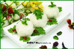 用冰糖、熟芝麻(舂细)、瓜片、花仁、核桃仁(均切细粒)与桂花或玫瑰、白糖合制成馅。用米粉包糖馅,做成50克一个的包子坯,入笼蒸熟即成。QQj