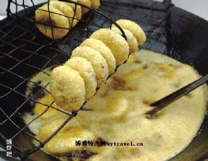其特色是外酥内软,油而不腻,咀嚼有味,口齿生香。据说此食品最初由椑木镇木板桥桥头一小吃店首创,并大受欢迎,行销至内江城内。人称“板板桥油炸粑”。至今油炸粑仍然是内江人喜爱的小吃,城区内已有多处店、摊专卖此种食品,热锅热灶,现炸现卖。热吃口味尤佳。