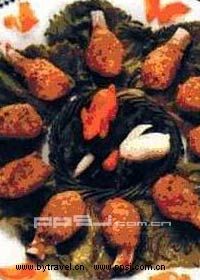 先将排骨拆枝脱肉,排骨枝用刀剁成每枝5厘米长,再把脱出来的排骨肉、瘦肉及肥肉、虾仁肉、荸荠、方鱼、生葱、红辣椒,分别用刀改切后拌在一起,放在砧板用刀剁成茸后,加入精盐、味精、麻油、川椒末拌匀,用手把肉茸分别镶在排骨枝上捏成20枝佛手状,沾一干面粉,再将面粉压实;将鸭蛋磕开,打成蛋液,然后把佛手状的排骨一枝一枝用鸭蛋液蘸过,再放入油鼎中用温油炸至熟透即成,配甜酱2碟上席。