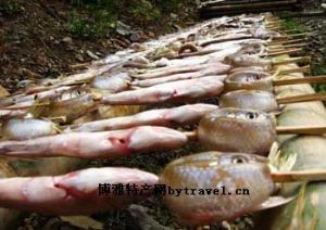 最适宜制“火把鱼”的鲜鱼,一般重量在一二两之间。先将捕来的鲜鱼去掉肠肚,继用约20厘米长的竹签穿连成一串,宛如小螺丝似的,置于青棡柴火上烘烤(禁用煤火烤),直至烤熟烤黄为宜,风干后即可上市出售。吃干“火把鱼”讲究烹调技术,一般采用干炸法,先将鱼串上的鱼逐一取下,把鱼骨鱼肉分别剔出,用沸菜油将鱼骨炸脆作干盘用;鱼肉用混合油(一般用猪油、植物油混合),将事前准备好的佐料如盐、味精、姜、葱蒜、油红辣椒、鱼香菜等放入锅内与鱼肉一起炒,适时铲出可食用,味道鲜美。