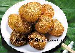 制作方法:炸。糯米淘洗干净浸泡后,加水磨成米浆装入布口袋吊起,待水分滤干后放置4-5小时,让吊浆面自然发酵至略有酸味后,加碱、糖揉匀搓成长条,下每个约重25克的剂子20个,搓成圆球形后,粘上芝麻入温油锅中炸,边炸边用平漏勺背反复踏压炸至泡空起来,壳呈金黄色即可。 本文来自 天下民宿 BNBVISTA.COM