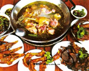 用花溪肥嫩的母鹅,将鹅头、鹅脚掌、鹅翅和鹅肝等内脏制成卤味,把鹅身切成块状入锅熬煮,加入香料及调料后继续煨煮,离火后拣去调味包和香料包,加入盐和味精。上桌时在火锅盆内加入鹅汤及鹅肉即可。鹅肉鲜嫩,汤清味醇,营养丰富。