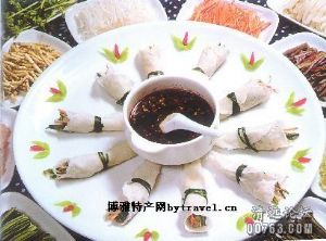 贵阳丝娃娃用米面粉做成薄氏状小圆饼烙熟,将萝卜丝、折耳根、绿豆芽、海带丝、炸黄豆、糊辣椒等多种佐料,包在面皮裹成小卷食用,别名素春卷。口感绵香四溢,极富特色。