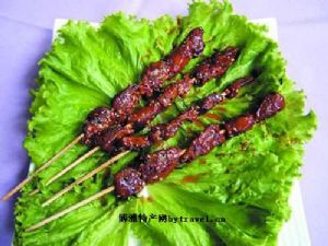 贵阳烤鸡皮是贵阳的街边小吃,是用鸡的皮子切成条状,串在铁丝上,反复烧烤而成。烤一串鸡皮要十多道工序。火炉旁边放了装青油、作料的碗碟。边烤边翻,边醮碗碟中的佐料,边用刷子刷上油。时有油烟扑鼻,香味四溢、烤出之油滴在炭火上,冒起阵阵明火,丝丝作响,蔚为壮观,我们一人吃了几串,香而化渣,酥而不绵,口感极好,至今思之。