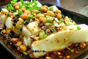 3、食用时用刀把米豆腐切成长6厘米、宽高各1厘米见方长条放入碗中,淋上红油,放上葱、姜、绿豆芽、炸花生米、炸黄豆、泡酸萝卜、黑大头菜、麻油、酱油、大蒜、醋、味精拌匀入味即可。 天下民宿