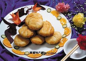 鸡肉饼贵阳地区著名的风味小吃。饼选用上等面粉制成,用油炸至外形呈橙黄色,饼皮酥脆,正面显现老虎斑花纹式样,背面显现菊花状。馅选用公鸡嫩肉、香菇、虾米等多种原料配制。皮薄馅嫩,香气扑鼻,令人百吃不厌。
