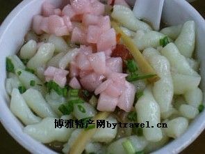 米虾为铜仁米豆腐,外型独特且别具风味。其外形如河虾,味道爽滑。在其上放上切碎的榨菜、酥花生、酥黄豆、盐菜、葱花等配菜,再淋上用红油、姜汁、酱油、麻油、花椒油、醋、蒜水等调成的汁。红白绿相间,酸辣可口,养颜开胃,对夏日中烦燥的胃也是一种保养。