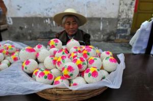 米花选用优质糯米加工而成,泡、香、酥,颗粒大。米花加糖、核桃仁末,用开水冲饮,其味香甜可口,别有风味,是弥渡人新春佳节迎宾待客的特殊饮料。用大麦芽渍出的糖稀将米花粘合后可以做出米花糖系列。其中以“狮子糖”和“圆糖”为米花糖系列产品之最。狮子糖经美术工艺精制为狮形,造型美观,典雅大方,多姿多彩,栩栩如生,为传统佳节喜庆食品。圆糖其特点是形体各异、色彩鲜艳、如花似珠、故名圆糖。伴与狮子糖摆设室内满屋生辉,格外喜庆。每逢春节,是家家户户竞相必备的年货。正月初一至十五期间,家里来的客人走时,送一份狮子圆糖,预示年内的生活甜甜美美,圆0满。