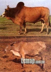 高峰牛最显著的特征是头短,额部宽平或微凹。眼圆大有神,耳朵比普通黄牛长大,角多粗短,公牛均有角,母牛多数无角,颈粗短,垂皮发达,体躯圆长,前躯发达雄壮,后躯呈圆筒形,背腰平直,尻部较平,尾粗且长,四肢较细,结实有力,蹄小而坚实,被毛短而细密,有光泽,毛色复杂,常见的有黑、褐、红、青和灰白色六种。