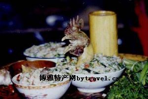 佤族人食用鸡肉也有几种制作方法,如烧、炒、煮、煮烂饭等。其中,以煮鸡肉烂饭吃最为普遍,也是佤族人招待宾客的一道上等佳品。佤族的鸡肉烂饭,不同于普通的大米饭,它既可以当饭又可以当菜。在很多情况下,是作为一道菜来食用的。鸡肉烂饭比普通大米饭要软得多,而比稀粥要干一些。佤族的鸡肉烂饭,就其处理鸡肉的方式和制作程序,有两种做法:一种叫做手撕鸡肉烂饭,另一种叫做刀砍鸡肉烂饭。其中,手撕鸡肉烂饭被认为是最讲究的鸡肉烂饭,制作工序较另一种复杂.其味也更美。下面就这两种鸡肉烂饭的制作方法和佐料配制,作简单的介绍。
