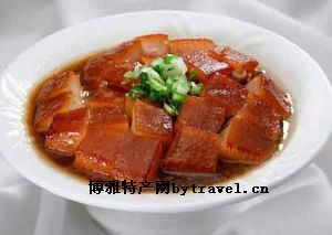 选用上等五花肉切成大块,入清水中煮至七成熟,起锅上色,入油锅中炸至金黄,放入调好的豉油汁中煮2小时,起锅改刀成型入蒸箱中蒸4小时即可出笼,用原汁勾芡浇在五花肉上,用青白菜汆水后围边。整体色泽红亮、咸甜适中,肉肥不烂,肥而不腻,老少皆宜,风味独特。