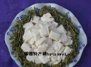 茶叶拌豆腐:用优质绿茶和豆腐通过沸茶水涮后辅以红油、姜油、蒜油等调制而成,清香回甜、有清凉泻火之功效。