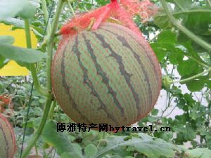 西瓜主根系,主根深度在1米以上,根群主要分布在20厘米--30厘米的根层内,根纤细易断,再生力弱,不耐移植。幼苗茎直立,4--5节后间伸长,5--6叶后匍匐生长,分枝性强,可形成3--4级侧枝。叶互生,有深裂、浅裂和全缘。雌雄异花同株,主茎第3--5节现雄花,5-7节有雌花,开花盛期可出现少数两性花。花冠黄色。子房下位,侧膜胎座。雌雄花均具蜜腺,虫媒花,花清晨开放下午闭合。果实有圆球、卵形、椭圆球、圆筒形等。果面平滑或具棱沟,表皮绿白、绿、深绿、墨绿、黑色,间有细网纹或条带。果肉有乳白、淡黄、深黄、淡红、大红等色。肉质分紧肉和沙瓤。种子扁平、卵圆或长卵圆形,平滑或具裂纹。种皮白、浅褐、褐、黑或棕色,单色或杂色。种子千粒重大籽类型100克--150克、中籽类型40克--60克、小籽类型20克--25克。子瓜类型150克--200克。
