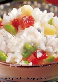 豆焖饭,是云民间传统时鲜风味饭品。每年春夏两季,各家各户都要吃上几次豆焖饭。届时,农家摘取碧绿欲滴的蚕豆与腊肉炒制后,再与大米合烹成饭。因它制作简便,有饭有菜,既荤又素,故被厨师加以改进,进入市场乃至上了筵席。席点豆焖饭,选用有名的宣威火腿,配上碧绿的菜豌豆米。成品色泽红、绿、白相映,滋味香、咸、甜、糯并存。( 昆明)