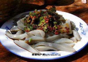做鸡豌豆凉粉的工序,也不是我们一般人想像的那么简单。要做鸡豌豆凉粉了,头天晚上,便用本地西龙潭里的天然矿泉水浸泡那鸡豌豆一夜,到第二天,鸡叫头遍的时候,便起来,用手推小石磨,“哼啦、哼啦……”慢吞吞地磨成鸡豌豆浆,用一口大铁锅,烧一大锅同样的西龙潭天然矿泉水。水沸腾起来,将那用手推磨细推出来的鸡豌豆浆,倒入大铁锅里一搅,不用加任何添加佐料,颜色便成了嫩嫩的绿黄色,那天然的嫩绿黄色,娇嫩得人都不敢去碰它。这样娇嫩的东西,就是不吃,看着也食欲大增啊。
