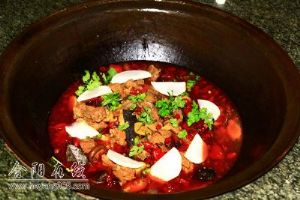 铁锅炖的种类很多。铁锅炖排骨是将剁好的猪排用凉水泡去血色,在开水锅中焯一下,去掉浮沫捞出用凉水冲洗干净。佐以料酒去掉腥味,炒好糖稀,给排骨上好色。接着在锅中温油,加入花椒、桂皮、香叶、姜片、辣椒等十八种名贵中药材煸炒出香味后,放入排骨慢炒几分钟,加入适量的水慢炖,放入盐、酱油、调料和香菇、萝卜等烹饪至烂熟。炖好的排骨肉质鲜美,营养丰富,麻、辣、香味俱全。 Copyright BNBVISTA.COM
