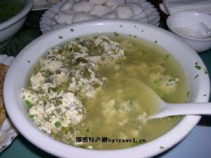 菜豆腐的主要原料是大豆。能否多出豆腐,浸泡大豆很有讲究。泡的时间长了不行,短了也不行。最好把握在四个钟头左右。如果是家庭自做自吃,可用小手磨磨成豆浆;如果需要供应食客,需求量大,就用打浆机,比较节省时间,但质量稍差。磨成的豆浆需用精箩过滤一下,将豆渣清除。也可用豆腐口袋揉捏,以免浪费浆汁而少出豆腐。入锅烧煮是个关键,待豆浆浮在水面上的“肥皂泡”慢慢向上蹿时,就要用勺子搅一搅,连续反复几次。片刻后豆浆就煮沸了,马上停火。最好用温度计测试一下,待降至七十度左右开始用酸浆水慢慢掺入,称为点豆腐。此举不能心急,欲速则不达。点浆的速度慢,豆腐才显嫩白。假若点过数次后的“浆”清了,就可将指甲盖般的豆花舀入筲箕中让它北凝结成团,再适当地压一压,挤掉过多的浆汁,豆腐便成功了。这时,再将淘净的大米倒进清浆里,煮得大米伸腰时,倒入块状的豆腐,加点小白菜或浆水菜、韭菜之类,就成为名副其实的菜豆腐了。吃这种饮食,一般不佐菜,只需配点豆瓣酱、青辣椒、鲜芫荽(香菜)即可。吃起来酸溜溜,辣乎乎,甜丝丝,极合口胃,老少咸宜。由于菜豆腐容易消化,含有丰富的蛋白质,是比较理想的膳食,现今已登大雅之堂,走进豪华宴席之中。当人们吃得油腻、倒胃之际,捧一碗别有风味的菜豆腐,真有飘飘欲仙之感!
