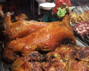 蒙古族传统名菜,为招待贵宾或举行重大庆典时的盛宴特制的佳肴。一般选用草原上膘肥、体重40斤左右的绵羊宰杀后,去毛带皮腹内加葱、姜、椒、盐等佐料整体烤制而成。烤完以后,羊形完整,羊跪在方木盘内,色泽金红,羊皮酥脆,羊肉嫩香。