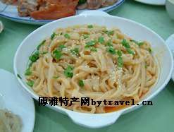 路井扯面,不是那种只扯一根头的牛头扯面,也不是那种用擀杖把面饼压成炉齿状,拉长后再分开的扯面,而是一扯数条、一锅下几斤的扯面,一次可盛十多碗。路井扯面和面与众不同,即用即和,不需在盆里回性。关键是按季节不同掌握好水温,把水面一气揉成团,然后用擀杖推成一公分左右薄厚的面集,再以擀杖为界尺,用刀把面集划成两公分宽窄的面条。两手一次可抓七八根,全身用力,反复回扯至薄厚均匀适中,下入滚水锅中。讲究火旺汤宽,随煮随湔,煮出的面条筋而不粘,滑溜可口。装碗后除调上盐醋外,还要加上物制的豆腐葱花臊子,再加油泼辣子,香气扑鼻,令人垂涎。