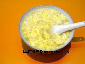 卖主多老翁,有特制小灶,特制铜锅。拉动风箱,卜卜作响,一头灰屑,声声叫卖。来客在灶前的细而长的条凳上坐了,说声:“一碗醪糟,一颗蛋”。卖主便长声重复:“一碗醪糟,一颗蛋——!”铜锅里添碗清水,放了糖精,三下两下烧开,呼地在锅沿敲碎一颗鸡蛋打入锅中,放适量的醪糟醅,再烧开,漂浮沫,加黄桂,迅速起锅倒入碗中。要问特点?酸甜味醇,可止渴,健胃,活血。