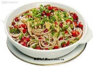 豌豆和小麦混合加工而成面粉,加入少许沙蒿面合成面块,停放半小时后、擀成面皮,其薄如纸,切作长丝,食时下锅煎煮,加上肉汤(鸡丝汤最好)或蛋汤,或西红柿汤等,味道清香,营养丰富。( 延安)