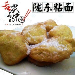 粘面又称粘面糕。把粘糜子碾成面粉,制做时,根据食量所需。先将一半面粉倒入开水锅中,用擀面杖搅熟后,舀出放在案上,再将剩余的一半面粉掺入,搓揉均匀后,撕成小拳头大的疙瘩,用大火在锅内蒸六个小时左右,俗称“发酵”。发至有甜味时,端出放于案上,搓揉成圆柱形,俗称面糕。切成圆薄坨片,用油炸或油锅烫烙后,撒入白糖或蜂蜜食用,粘而又甜,老幼喜食。