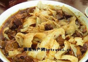 具有悠久的历史,其制作工艺较为简单,而做法非常耐人寻味,将和匀的面团顶在头上,或扛在肩上,或托在手掌上,再以剖力耐之,似在舞蹈,煮熟后面色白,酱鲜红,味香可口,尤以甘肃安西县生产的禾麟面粉为好。