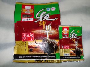 五香牛肉干的主要原料,是青海高原特产的新鲜耗牛肉。制法是将鲜肉剔除筋皮,以净肉加白水煮熟后,再切成长一厘米、宽一厘米、厚半厘米的小块,加入花椒粉、咖喱粉、味精、料酒、糖、盐等佐料干炒,最后再烘干、装袋。由于制作方法考究,成品色鲜,营养丰富,既保持了耗牛肉的风味,又有香气浓郁,滋味鲜美,久吃不腻等特点。近年来,来青海的客人和旅游者,争购青海牛肉干,当做一种有青海乡土特色的食品,使青海牛肉干更加名声大震。