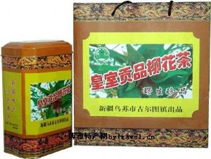柳花茶是一种河柳树上开的“花”,产地在新疆乌苏四棵树河谷流域下游的古尔图镇。古尔图,蒙古语意指桥,因该地有一木桥而得名。柳花茶在清朝乾隆和光绪年间为西域珍品,是蒙古王爷向朝廷进献的贡品。