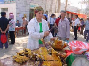 在且末城镇的巴扎上(集市),设有烤全羊摊档,专门剁块零卖。