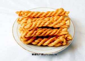 又称馓子麻花。以特制面条拧细,形如剪刀,入油炸成。酥脆可口,桂花香溢