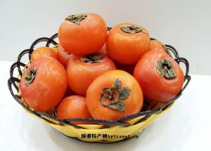 柿子是吉祥如意的象征,圆圆的果实,代表团圆美满,橙红的色泽,寓意红红火火,“柿子”的“柿”字谐音“事事如意”、“世代吉祥”等。在柿子品种中,磨盘柿以果实大,果形美,光洁艳丽,是目前世界上最优良的涩柿品种之一,盘山山区种植历史非常悠久,所产柿子品质极佳。每百克柿子中,含有蛋白质0.7克、脂肪0.1克、糖11克,能产生48千卡热量。此外,柿子还含有钙、磷、铁等矿物质及多种维生素。但是,大量贪食,或不合理食柿子,则可造成胃“柿结石”,因为,柿子中含有大量的果胶和胶酚,这两种成分在柿胶和柿核中尤其多。