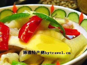 水晶肚的外皮有两种,一种是用猪大肠灌制(即一般称为肚子)。另一种是猪小肚(即猪膀胱)灌制。用猪大肚灌制,最好选择有肚膜的比较合适。水晶肚不用淀粉凝结,是靠猪肉皮冻凝固而成。