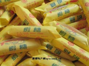“秋林牌”大虾糖哈尔滨的传统食品,是采用特级优质东北白砂糖、优质山东花生伴以传统生产工艺精制而成。该品的选料精、作工考究,线条清晰、形似大虾,皮薄馅酥、香甜不腻、松酥可口,具有高营养、高热量食品之特点,曾荣获中国首届食品博览会“银奖”和商业部及龙江省优质产品称号,素有“双优”产品之雅称,并于1992年评为省、市名牌产品,是馈赠宾友,老少皆宜之佳品。