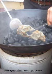 这种方法是将石块烧热,谷物直接放在石上而制熟。这主要是利用石块传热慢,散热也慢,布热比较均匀的特点,以达到控制火候的目的。这种方法一直为后人所沿用,唐朝时有“石鏊饼”之制,明清谓之“天然饼”。