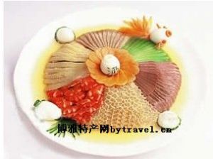 原料:金钱肚150克,猪舌100克,鹅肫100克,青莴笋100克,斑节虾100克,三黄鸡100克,白干100克,花生米100克,刀豆100克。