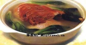 将肥嫩鸭与正宗金华火腿脚踵放在土砂锅内,加调料用微火焖炖而成。火踵红艳浓香,鸭肉鲜嫩油润、汤汁浮白似奶,为清和园等老字号当家名菜之一。食之开胃生津、滋阴补虚、治病后虚弱。