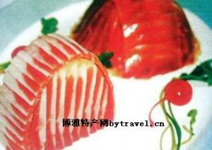 选择皮色黄亮、肉红似火,香气浓郁、咸淡相宜、形似竹叶,色、香、味、形“四绝”的正宗金华火腿为原料,取其精华部位--中腰峰的上段雄片肉制作。厨师运用娴熟精致的刀工技术,切成大小厚薄均等的薄片若干,整齐地排列成拱桥型。它是一道咸淡适口、滋味醇和、富有余香、造型漂亮的冷盘菜