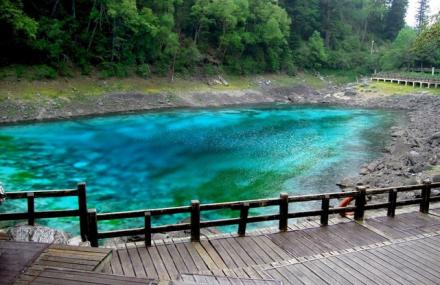 五彩池是九寨沟湖泊中的精粹,上半部呈碧蓝色,下半部则呈橙红色,左边呈天蓝色,右边则呈橄榄绿的了。湖里生长着水绵、轮藻、小蕨等水生植物群落,还生长着芦苇、节节草、水灯芯等草本植物。这些水生群落所含叶绿素深浅不同,在富含碳酸钙质的湖水里,能呈现不同的颜色。同一湖泊里,有的水域蔚蓝,有的湾汊浅绿,有的水色绛黄,有的流泉粉蓝,变化无穷,煞是好看!冬季四周冰天雪地,而这个五彩斑斓的小海子却不冻冰,甚为奇绝。 |