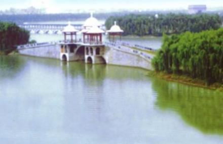 环抱“世界风光”的柳堤东南面有一奇特建筑五冠桥,是仿造扬州瘦西湖上的五亭桥而建成的。五亭桥是扬州瘦西湖的象征,桥上因建五个亭子得名。这里的五冠桥把五个亭子改成了五个形状如冠的建筑,其余均同五亭桥。造桥者把桥基建成“拱”形,主桥为单曲拱桥,旁构4翼,每翼各有3个半拱的桥洞,连同引桥两个扇形桥洞,共有15个孔,孔孔相连,正面望去连同倒影,形成5孔,大小不一,形状各异;泛舟桥下,孔孔相通,犹如城堡,被桥梁专家评价为“中国古城交通桥与观赏桥结合的典范”。 |