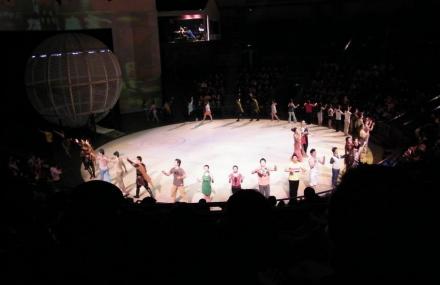 “裸眼3D”。多媒体全面升级。以独特的3D图像交织解码技术,完美合成立体影像。180度环幕,地面投影,圆形筒幕,特效、渲染、调色,将3D立体真实世界完美表现出来。摘掉眼镜,摆脱束缚,走进3D立体世界,去漫游三维场景,去穿梭时空隧道,去回味时光流年,去看光与影舞出宇宙星空,江南水乡,茶园景色,月光云海。“碧波轻舟”。水幕将整个舞台变成了一泓湖水,水幕中出现了飘飘忽忽的一个光体,由远至近,由小变大,那是中国古代文明的象征——司南。只见司南在碧波中演变成一叶轻舟,缓缓飘来。<...