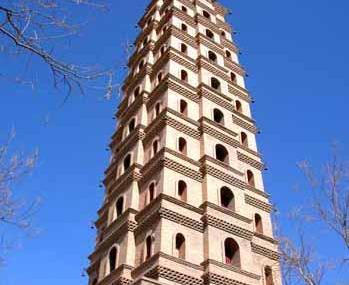 又称赫宝塔、黑宝塔。坐落在宁夏银川市北郊海宝塔寺内,因其与银川市西的承天寺塔遥遥相对,又俗称北塔,始建年代不详,相传为公元五世纪初十六国之一的夏国国王赫连勃勃重建。清朝康熙五十一年和乾隆四十三年曾因两次地震而重新修缮。海宝塔与市内承天寺塔遥查呼应,是宁夏八景之一,素有“古塔凌霄”之誉。海宝塔塔身坐落在宽敞的方形六基上,连同台基总共十一级,通高54米,塔身呈正方形,四面中间又各突出一脊梁,呈“亚”字形,为我国十六名塔之一。北塔寺坐西朝东,主要建筑有山门、接引佛殿、大雄宝殿...