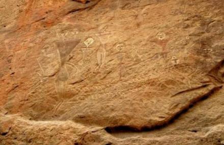 是一幅国内及世界上罕见的生殖崇拜岩画。位于昌吉州呼图壁县的天山腹地,两条山溪汇流处的西北岸的新第三纪的粉砂岩壁上。岩面平整,距地表约10米上下。画面东西长14米,上下高9米多,整个面积达120平方米左右。上面刻绘着二三百个大小不等,身姿各异的人物和动物。大者高2.04米,小者19厘米。有男有女,或站或卧,或衣或裸,男女合图、双头同体、三头同体图像。岩画采用浅浮雕的手法,所雕人物的面部均面型瘦长,眉弓发育,大眼、高鼻、小嘴,形象秀丽。头戴高帽,帽著翎毛,作舞蹈状。相当数量...