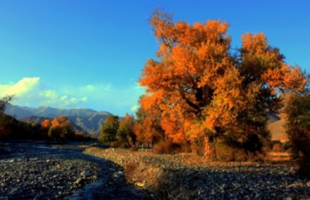 鄂托克赛尔河谷位于温泉县城南面,最近的地方离县城约30公里。鄂托克赛尔河谷的秋色仿佛一幅色调饱满的油画:金黄色的树叶中点缀着串串红果,哗哗流淌的鄂托克赛尔河闪着银光,近处悠然吃草的羊群,牛群,骆驼,马群等与远处环抱的群山相映成趣。 |